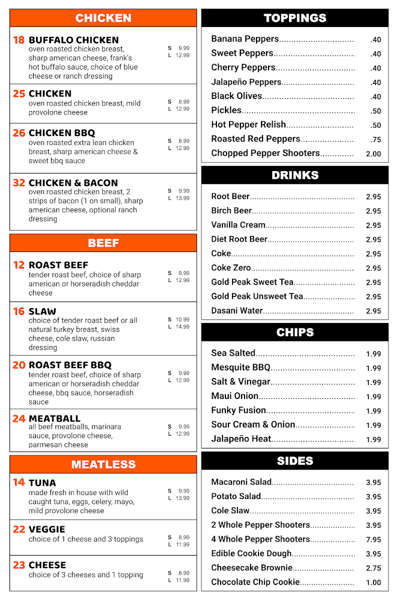 Coteghino, hot soppressata, hot capicola, aged sharp provolone cheese. Choose your ingredients, spreads and toppings. Add pepper shooters to make it a Diablo Shooter.